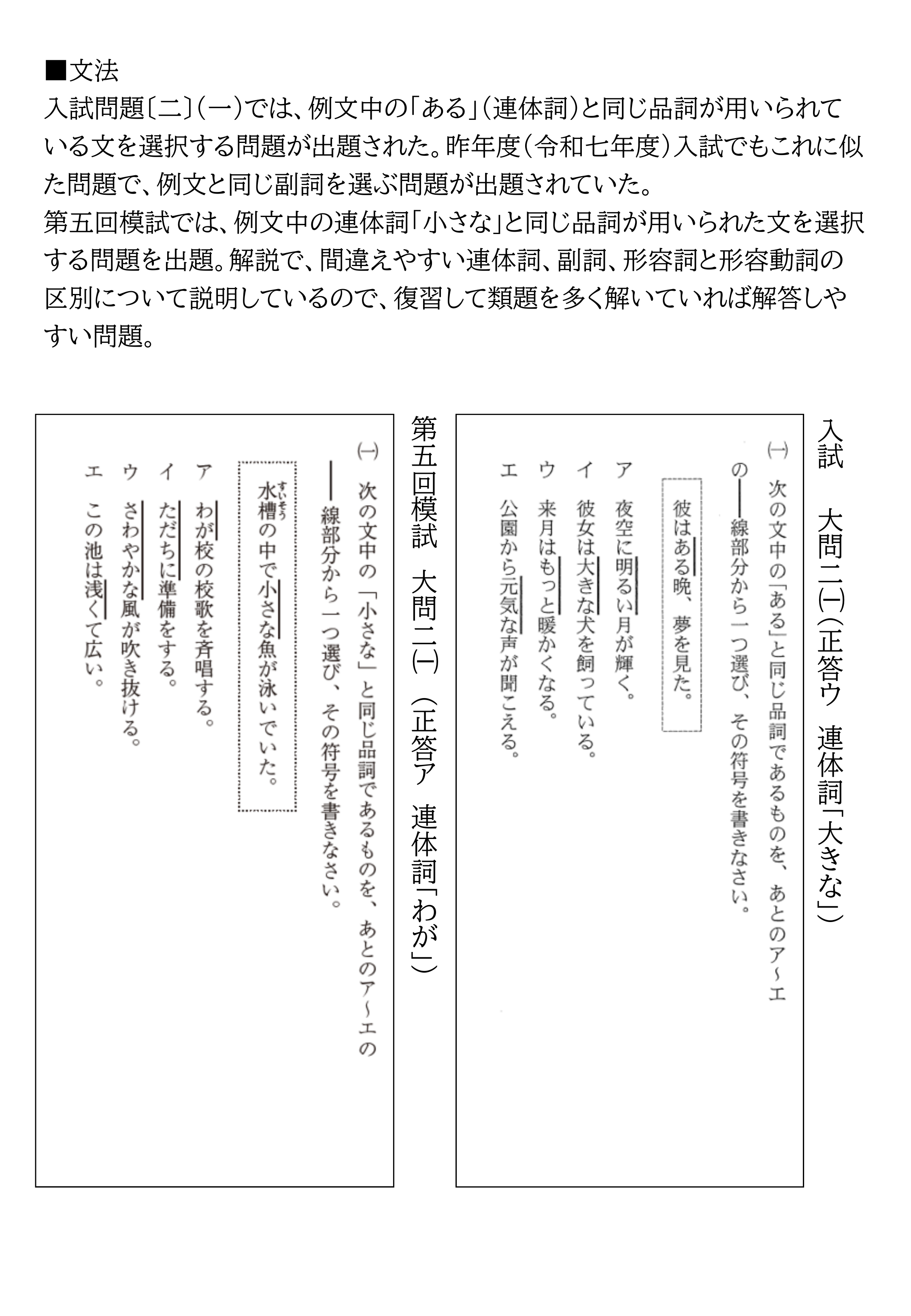 文法・基礎知識では、近年古文読解で定着してきた会話文の空欄補充形式で、敬語の問題が出題された。敬語の知識は令和二年度入試以来、五年ぶりの出題。過去の入試では、令和六年度に会話文の空欄補充形式で慣用句やことわざの知識を問う問題が出題されている。