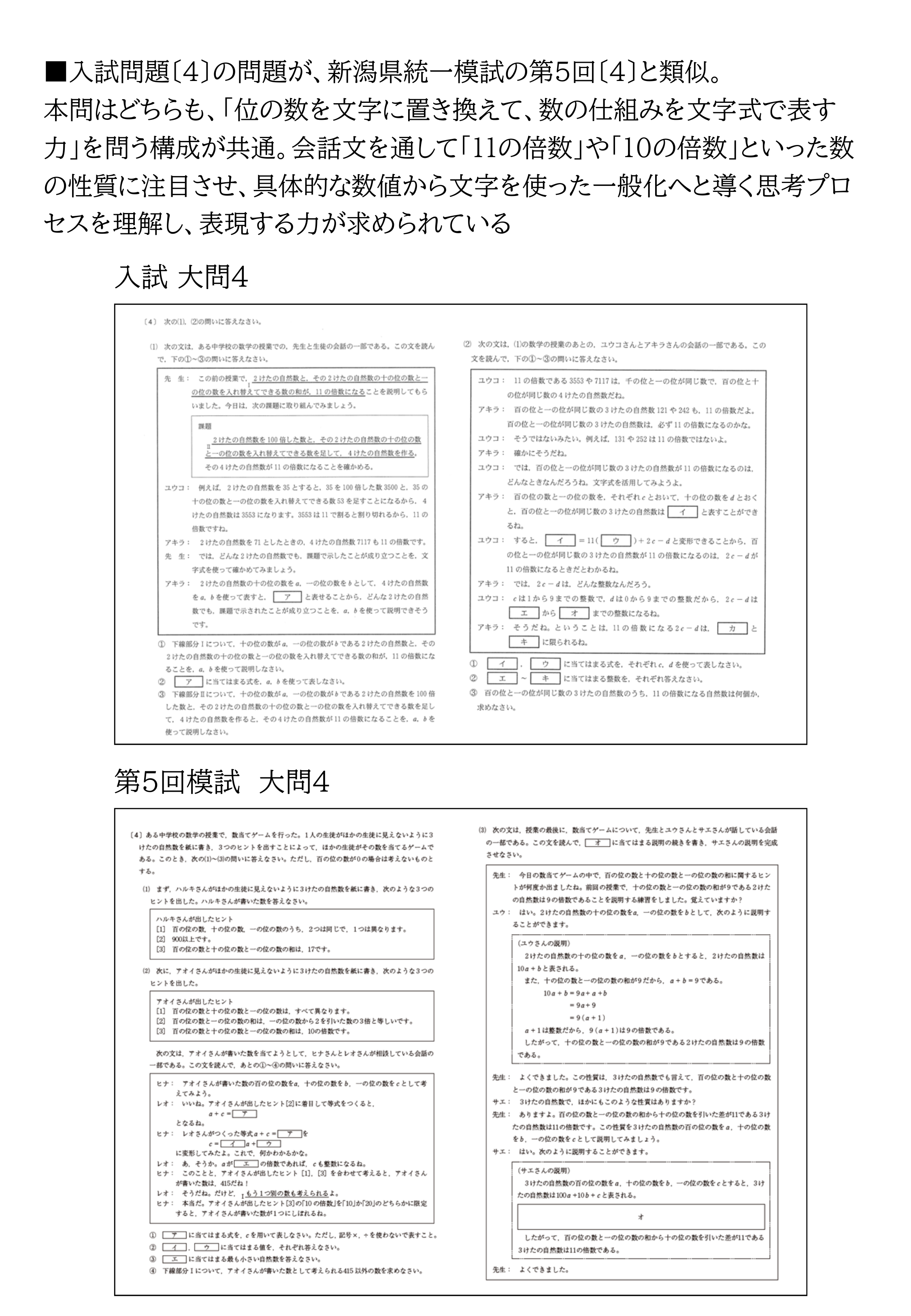 - 大問4(数と式): 2けたの自然数に関する既習知識を土台とし、それを3・4けたの場合へと広げて考える発展的な考察が求められた。