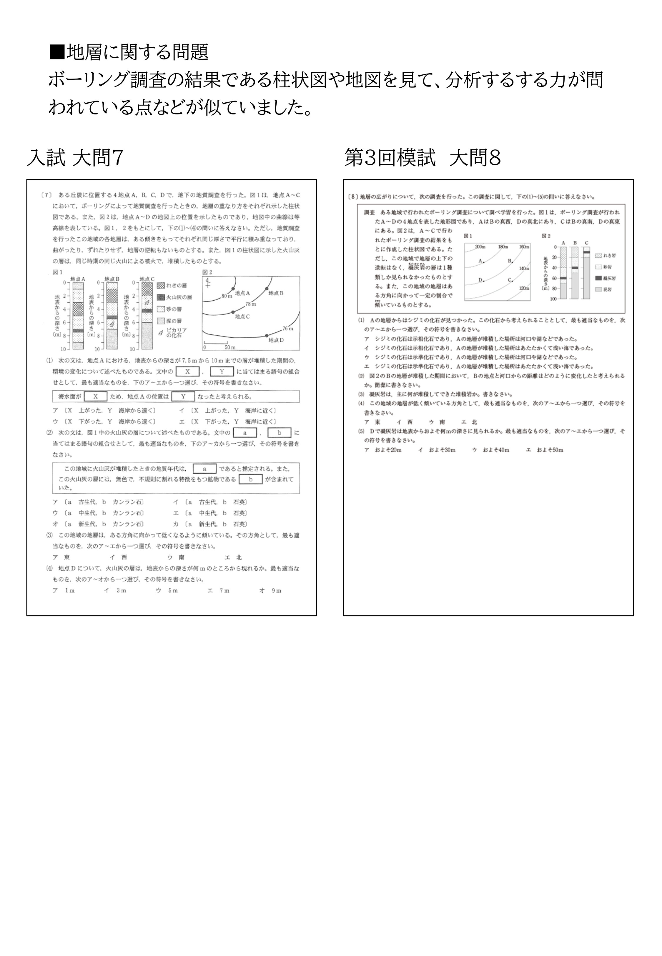 - 大問7(地学): 複数のボーリング調査を扱う柱状図の問題。地図や地層の情報を組み合わせ、地形の傾斜や火山灰層の深さを判断させるなど、実践的なデータの分析力が求められた。